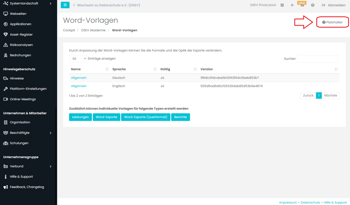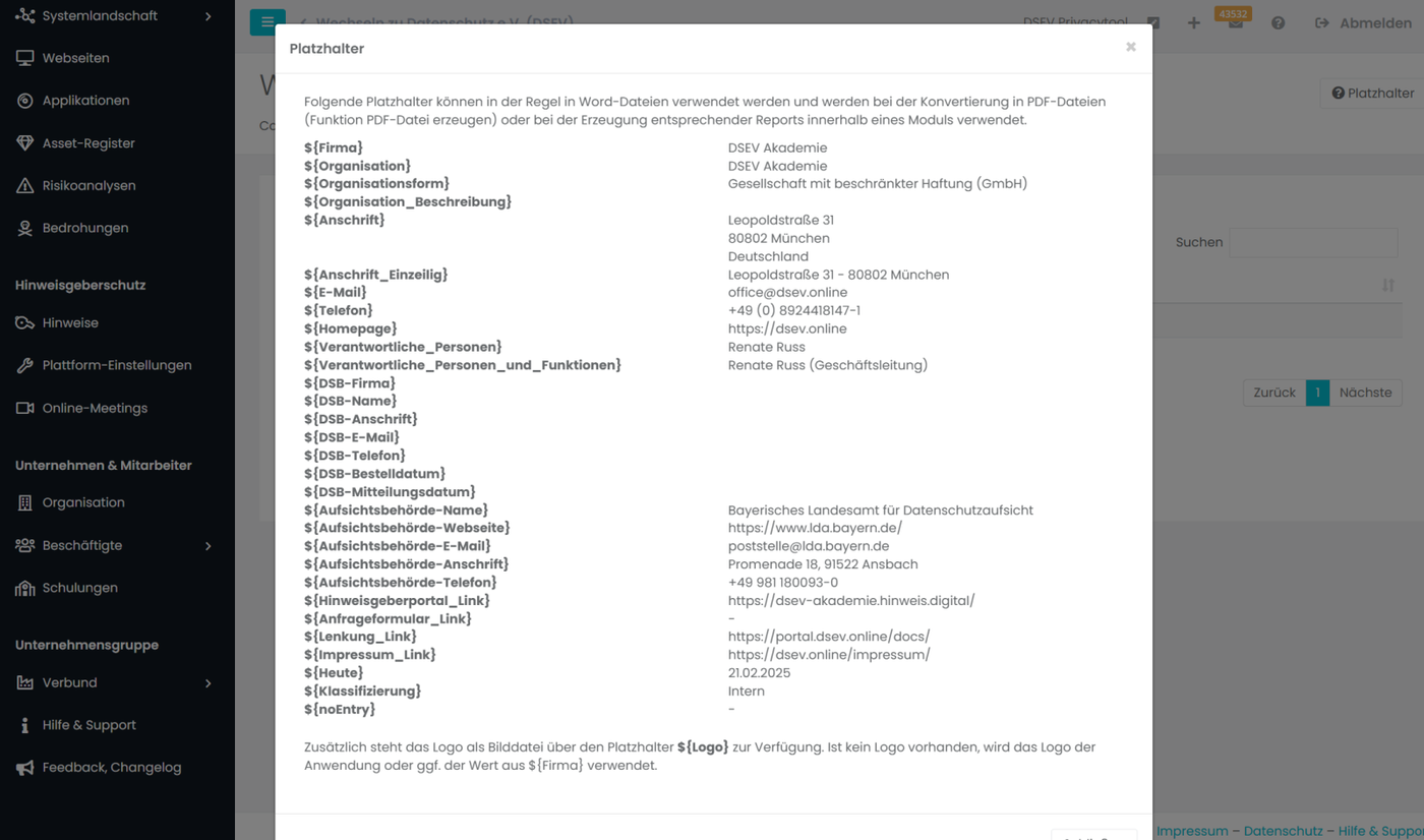 In der angezeigten Maske klicken Sie oben rechts auf Platzhalter, um eine Übersicht aller verfügbaren Platzhalter einzusehen. Diese Platzhalter können in Word-Dokumenten genutzt werden und sind ebenfalls bei der Umwandlung in PDF-Dateien sowie bei der Erstellung von Berichten verfügbar.