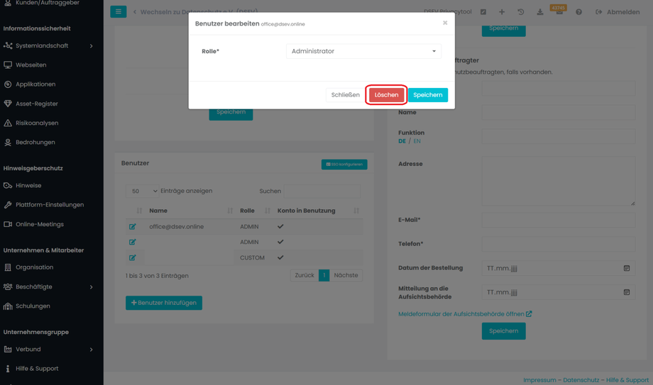 Hinweis: Der Benutzer wird lediglich aus der aktuellen Organisation entfernt; das Benutzerkonto im DPMS bleibt bestehen und wird bei Inaktivität automatisch gelöscht