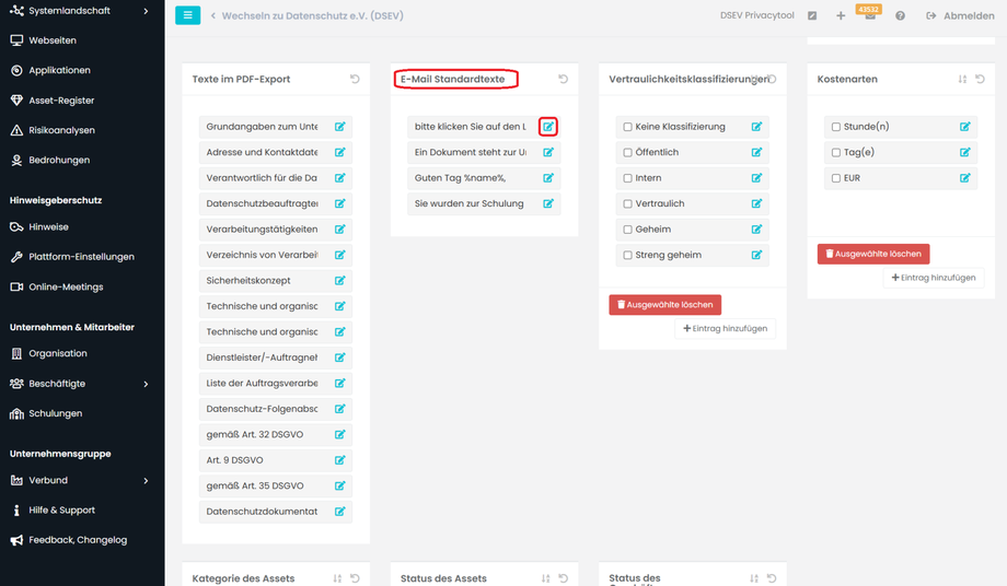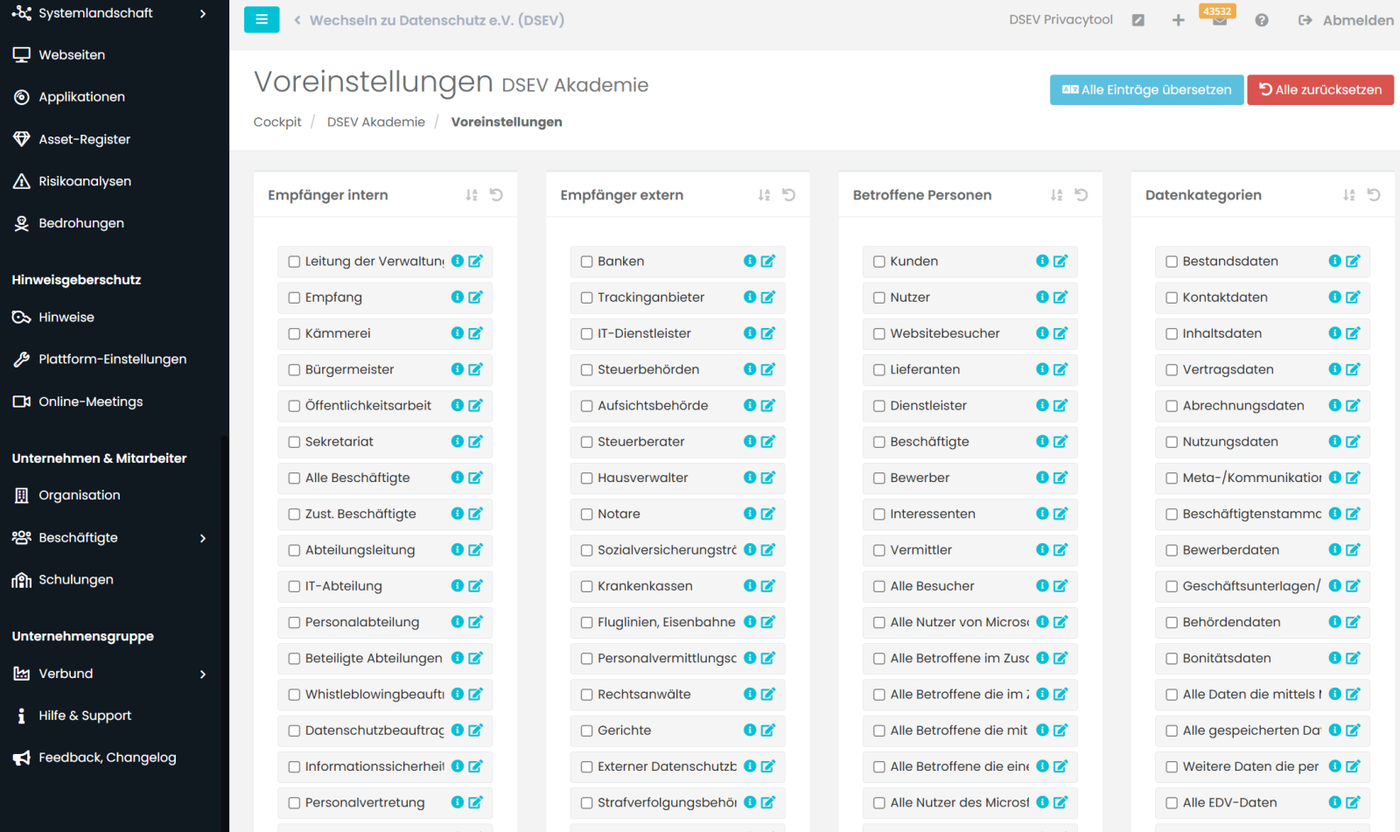 Achtung: Änderungen an den Voreinstellungen wirken sich unmittelbar auf alle bestehenden Einträge aus, wie z. B. Verarbeitungstätigkeiten (VVT) oder gemeldete Datenschutzverletzungen. Geänderte oder gelöschte Voreinstellungen werden automatisch in allen betroffenen Einträgen aktualisiert. Diese Änderungen sind dauerhaft und können nicht rückgängig gemacht werden. Prüfen Sie daher geplante Anpassungen sorgfältig, um unbeabsichtigte Auswirkungen zu vermeiden.