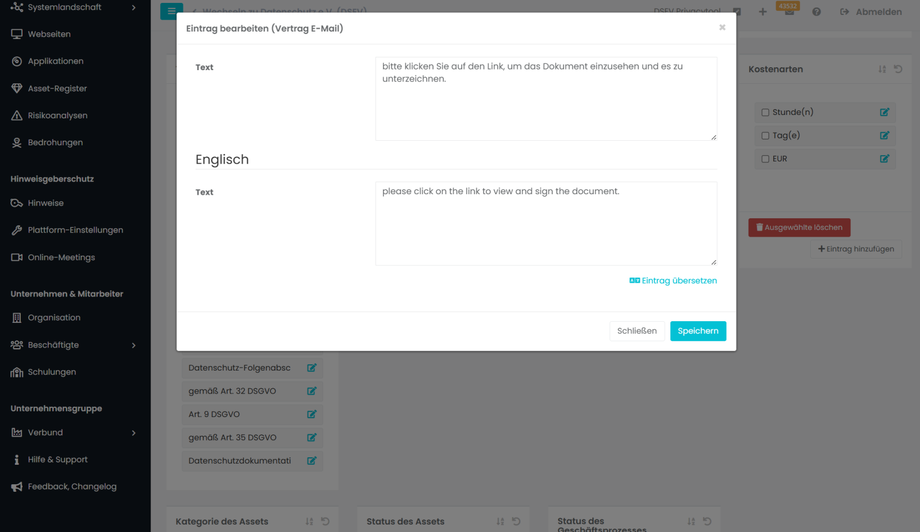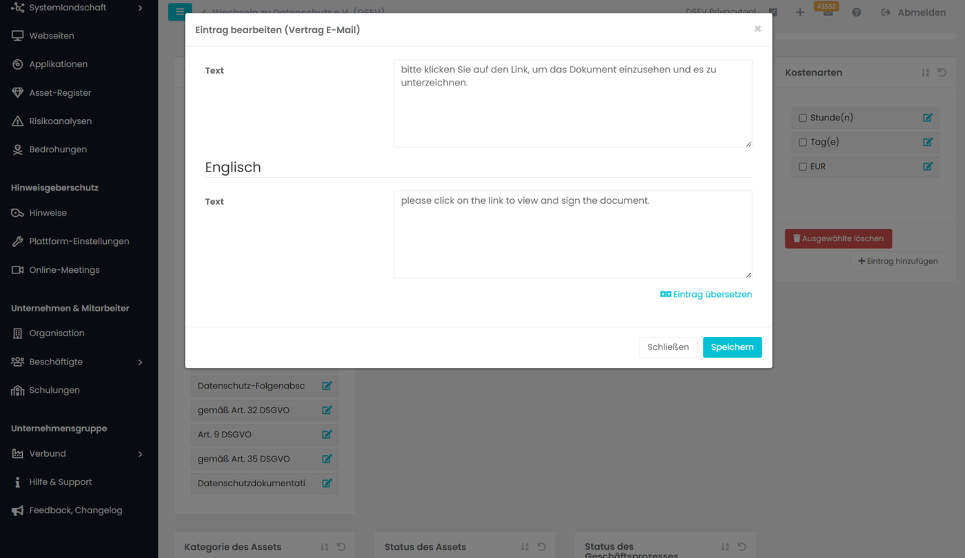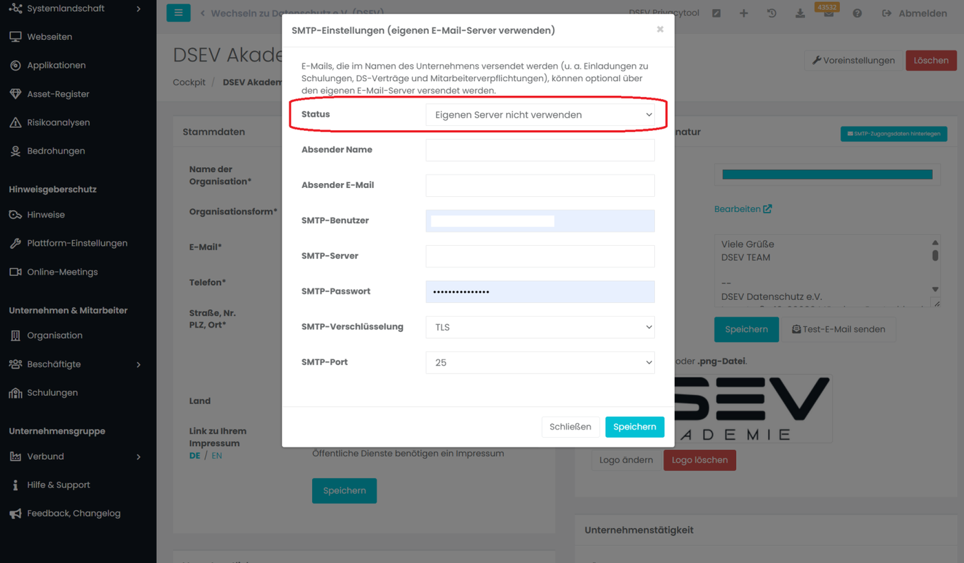 E-Mails, die im Namen des Unternehmens über das System versendet werden, wie beispielsweise Einladungen zu Schulungen, Datenschutzverträge oder Mitarbeiterverpflichtungen, können optional über den firmeneigenen E-Mail-Server versendet werden. Dies stärkt die Markenidentität und erhöht das Vertrauen der Empfänger durch die Verwendung einer authentischen Absenderadresse.