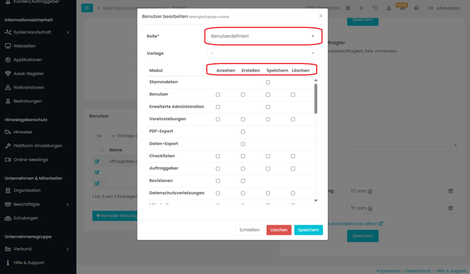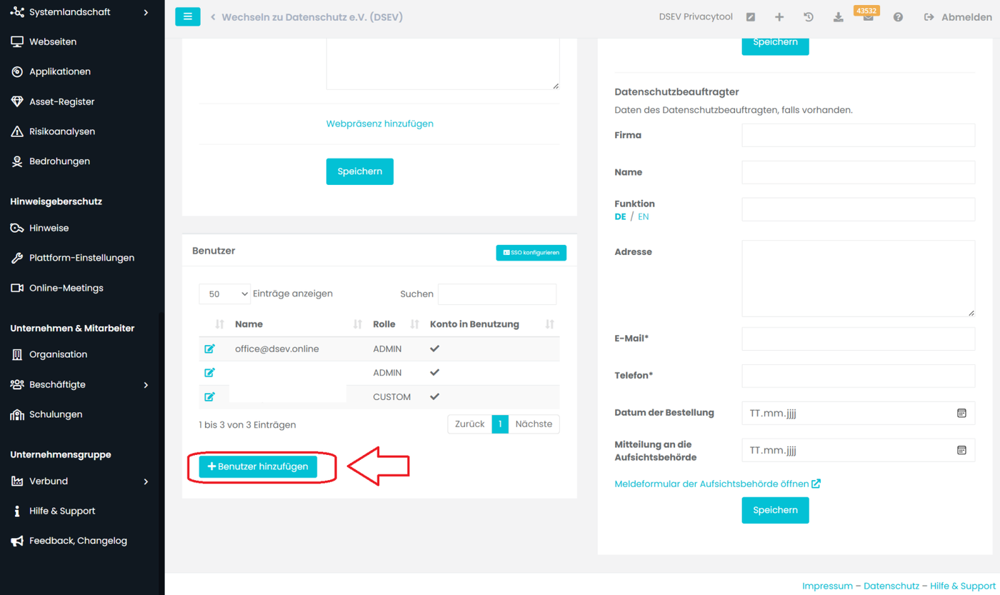 Im Bereich Benutzer sehen Sie alle eingerichteten Benutzer und deren Rollen. Sie können neue Benutzer hinzufügen oder bestehende Benutzer bearbeiten, einschließlich der Rechtevergabe.