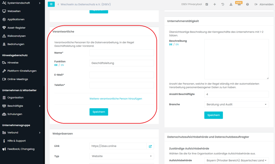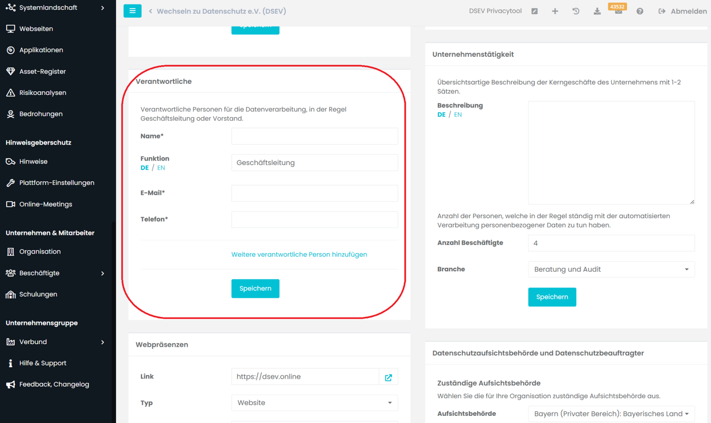 Im Bereich Verantwortliche können die Daten der verantwortlichen Personen erfasst werden, einschließlich: