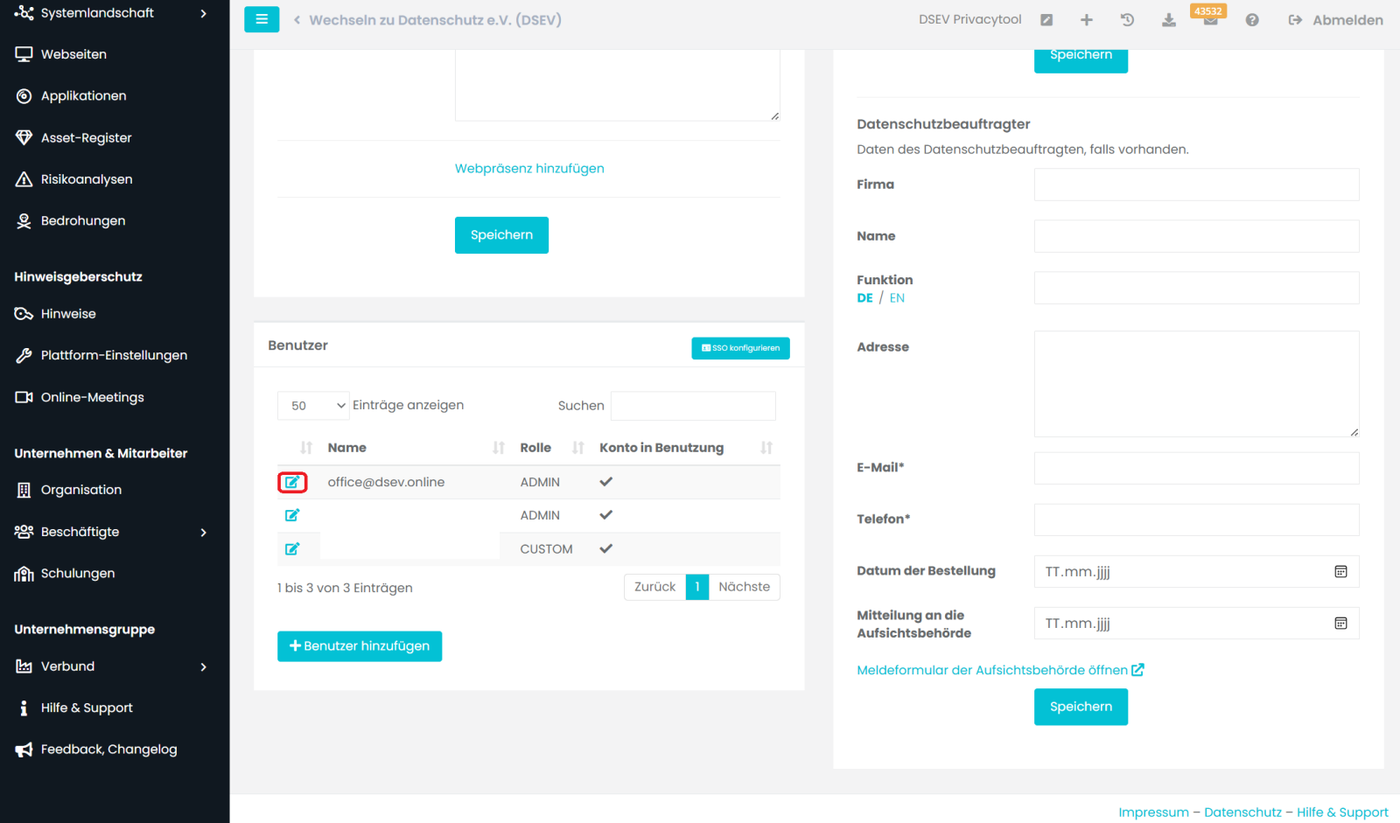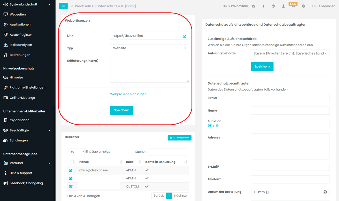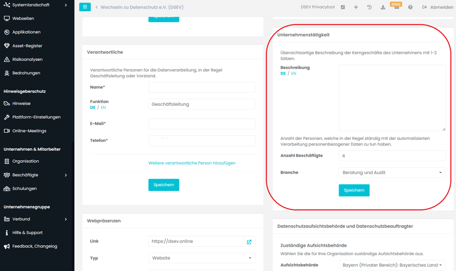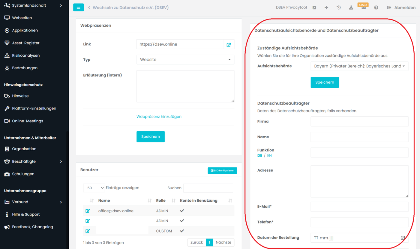 In diesem Abschnitt kann die zuständige Aufsichtsbehörde über ein Pull-Down-Menü ausgewählt werden. Zusätzlich können Angaben zum Datenschutzbeauftragten (DSB) erfasst werden, einschließlich des Datums der Bestellung und des Datums der Mitteilung an die Aufsichtsbehörde. Ein Direktlink führt zum Meldeformular für den DSB bei der Aufsichtsbehörde
