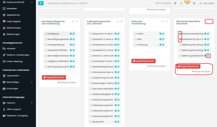 Voreinstellungen anpassen: In den Voreinstellungen können Sie verschiedene systemseitig verwendete Einstellungen zur Verwaltung der Verarbeitungstätigkeiten anpassen, darunter: