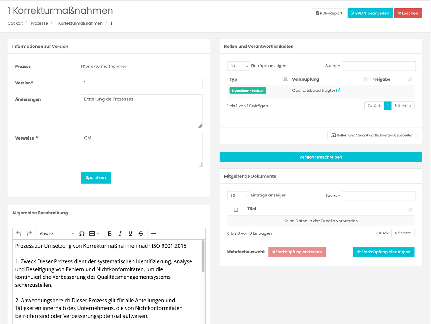 Wählt man einen bestimmten Prozess aus, etwa „10.2.0 Korrekturmaßnahmen“, öffnet sich die Detailansicht mit spezifischen Informationen und Bearbeitungsfunktionen. Sie gliedert sich in folgende Bereiche: