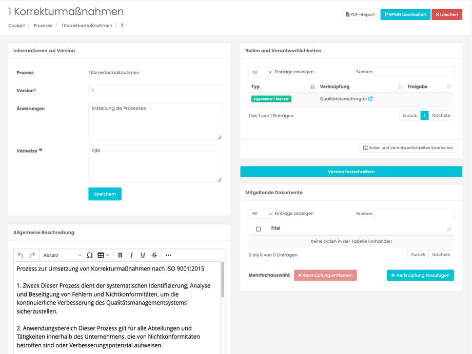 Mit diesem Vorgehen lässt sich der gesamte Lebenszyklus eines Prozesses lückenlos abbilden: von der ersten Entwurfsversion über die Freigabe und Veröffentlichung bis hin zur detaillierten Dokumentation in Form eines PDF-Berichts.