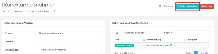 In diesem Eintrag erfahren Sie, wie Sie einen angelegten Prozess bearbeiten und mit weiteren Informationen anreichern können. Dabei stehen Ihnen mehrere Bereiche zur Verfügung, um Versionen zu verwalten, Verantwortlichkeiten zuzuweisen, Dokumente zu verknüpfen und den Prozess bei Bedarf mithilfe eines BPMN-Diagramms grafisch darzustellen.