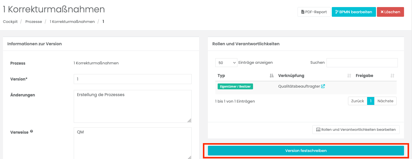 Bevor Sie eine Version festschreiben, stellen Sie bitte sicher, dass alle Inhalte (Stammdaten, Prozessbeschreibung, BPMN-Diagramm, mitgeltende Dokumente etc.) vollständig sind.