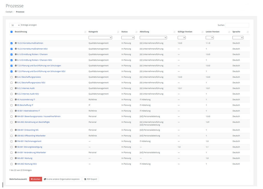 Die Tabellenansicht ermöglicht das Filtern, Sortieren und gezielte Suchen nach Prozessen. Über die Aktionsbuttons können neue Prozesse hinzugefügt, bestehende gelöscht oder in andere Organisationen kopiert werden. Zudem lassen sich PDF-Reports direkt aus der Tabellenansicht generieren, um Prozesse einzeln oder gesammelt zu dokumentieren.