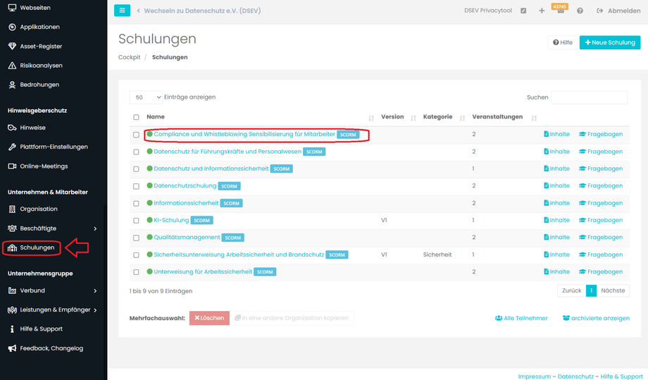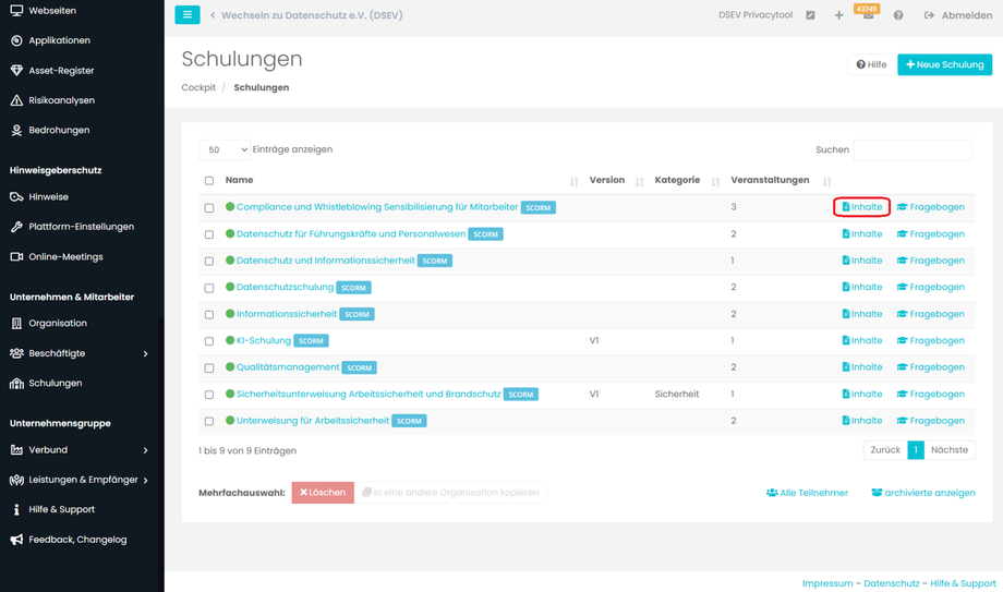 Zum Bearbeiten der Schulung klicken Sie auf den Namen der Schulung > Inhalte oder direkt hinter dem Namen der Schulung auf Inhalte.