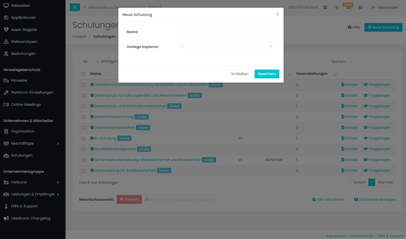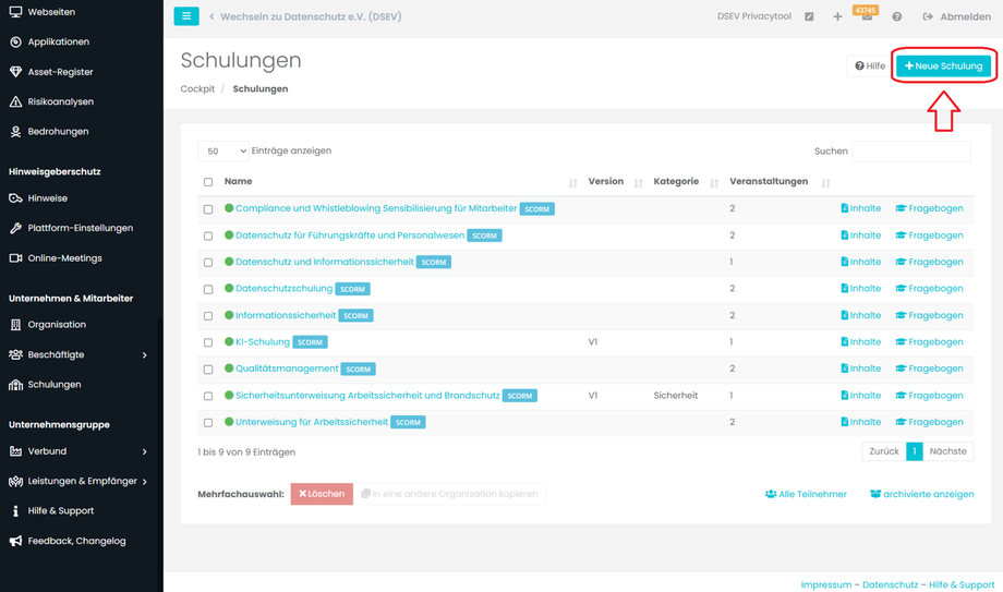 Sofern Sie dann die Schulung starten möchten, können Sie über Neue Schulung eine Schulung definieren und über diese Veranstaltung starten. Beachten Sie, dass die Inhalte und ggf. das Quiz vorher hinterlegt sein müssen.