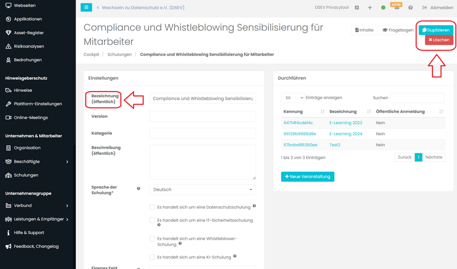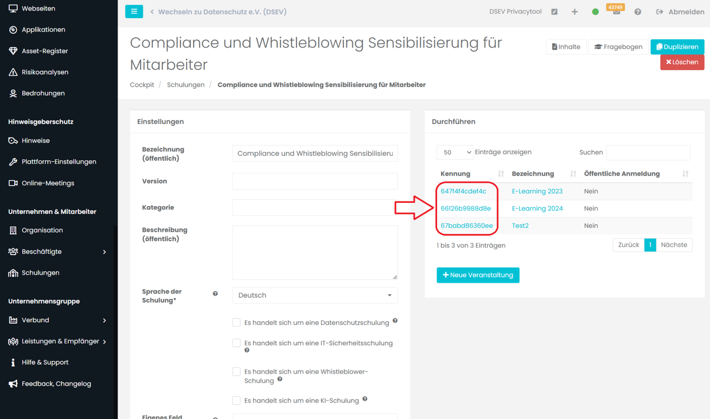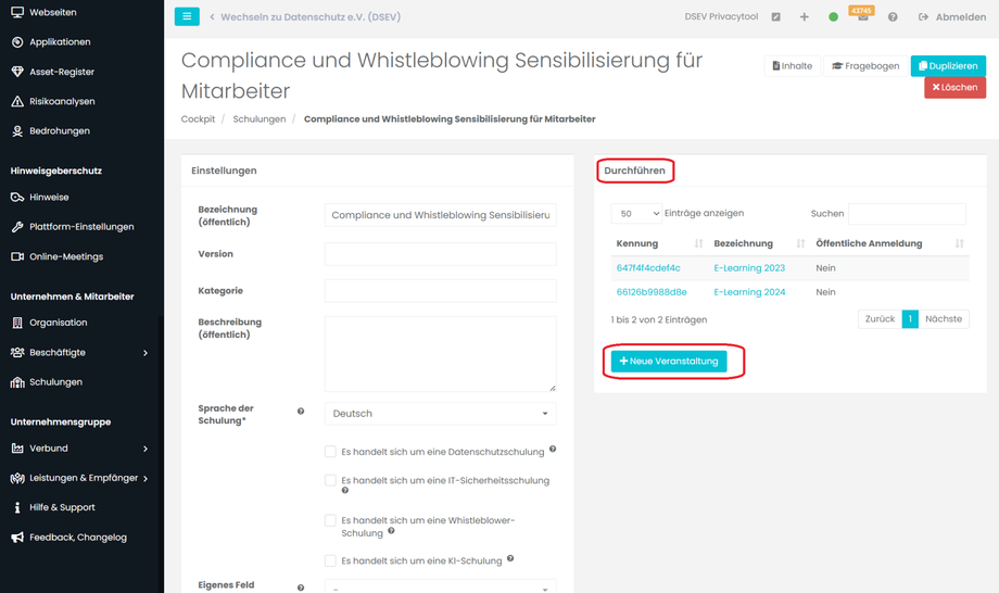 Auf der rechten Seite unter Durchführen können Sie Ihre Veranstaltung anlegen. Es empfiehlt sich entsprechende Namen zu verwenden (z. B. Datenschutzschulung Personal 2023).