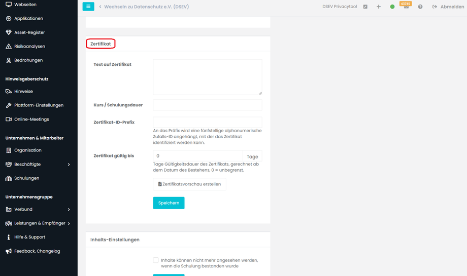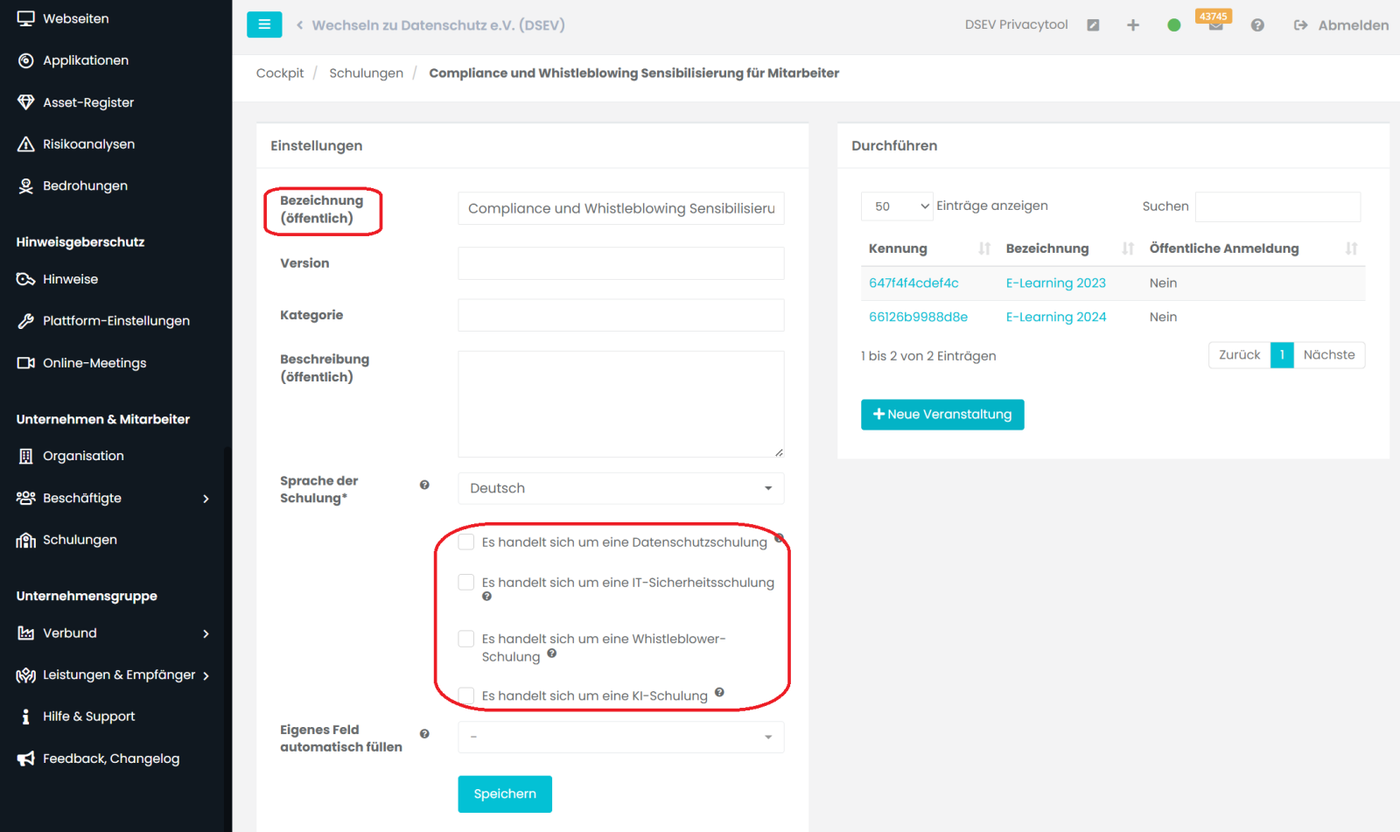 Im ersten Schritt müssen die Grundangaben für die jeweilige Schulung hinterlegt werden. Im Feld Bezeichnung sollte für den Nutzer (Mitarbeiter) eine kurze Information hinterlegt werden, um welche Schulung es sich handelt. Somit wird der Nutzer (Mitarbeiter) vor dem Start der Schulung über das Schulungsthema informiert. Wird hinterlegt „Es handelt sich um eine Datenschutzschulung“ oder „Es handelt sich um eine IT- Sicherheitsschulung“ so wird automatisch das Datum der letzten Schulung beim Mitarbeiter angelegt.