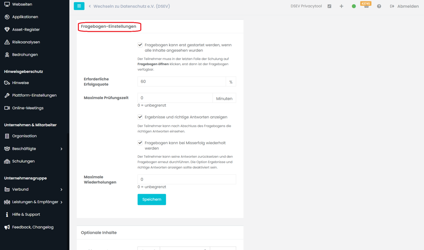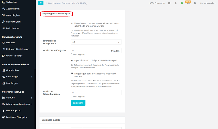 Das Quiz dient als Test für die Schulung und wird auch als Quiz hinterlegt. Weitere Einstellungen können Sie vornehmen. Beispiel: Zeit für Quizze, Kursdauer, Schulungsdauer etc.