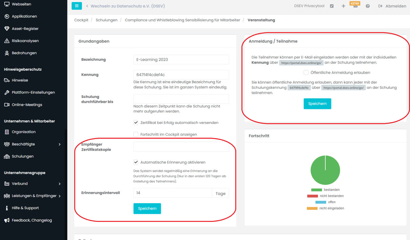 Wählen Sie die Schulung aus. Hier haben Sie die Möglichkeit Einstellungen zu den Schulungen vorzunehmen.