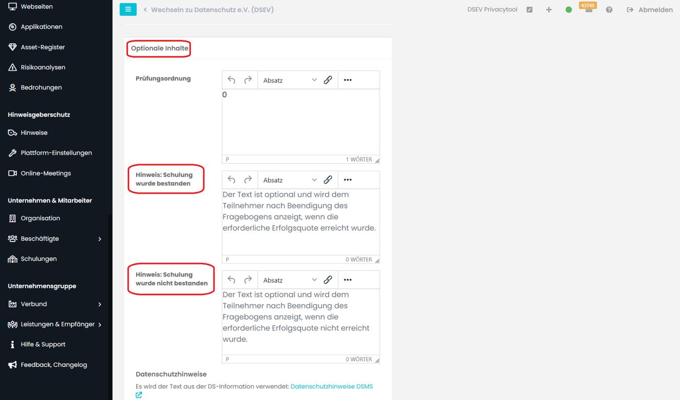 Sie können Hinweise bei „bestandener Schulung“ oder bei „nicht bestandener Schulung“ hinterlegen.