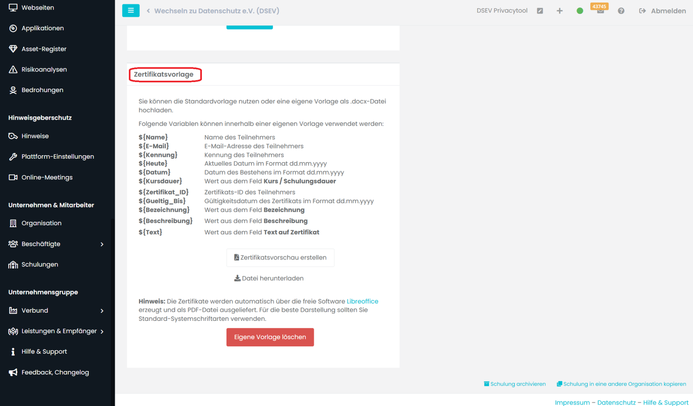 Sie können das hinterlegte Standardzertifikat nutzen oder ein Zertifikat nach Ihren Wünschen als .docx Version erstellen und anschließend in die Software laden.