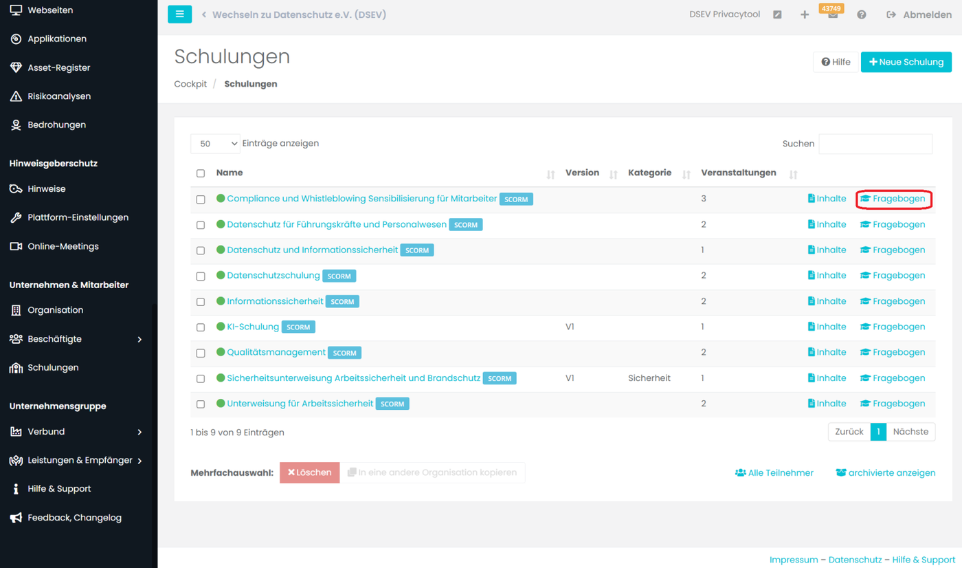 Zum Bearbeiten des Fragebogens klicken Sie auf den Namen der Schulung > Fragebogen oder direkt hinter dem Namen der Schulung auf Fragebogen.