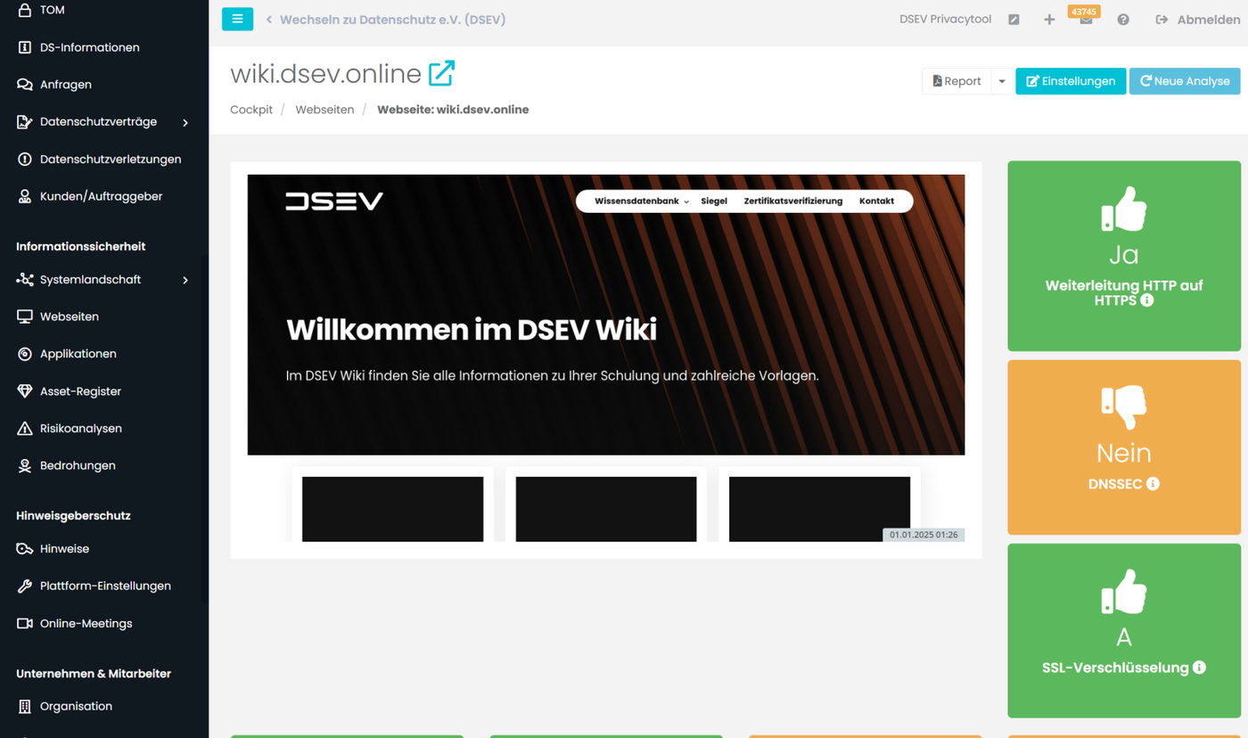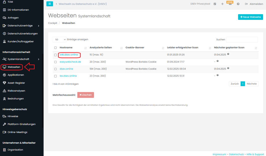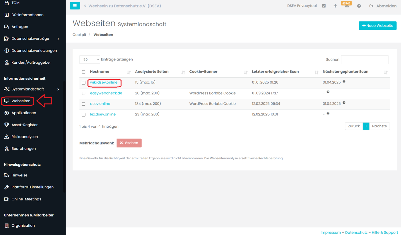 Sie können im System die URLs Ihrer Webseiten einpflegen. Der Vorteil: Die Software führt eine generelle Überprüfung der Webseiten durch und gibt Hinweise auf deren Konformität (inkl. Monitoring).
