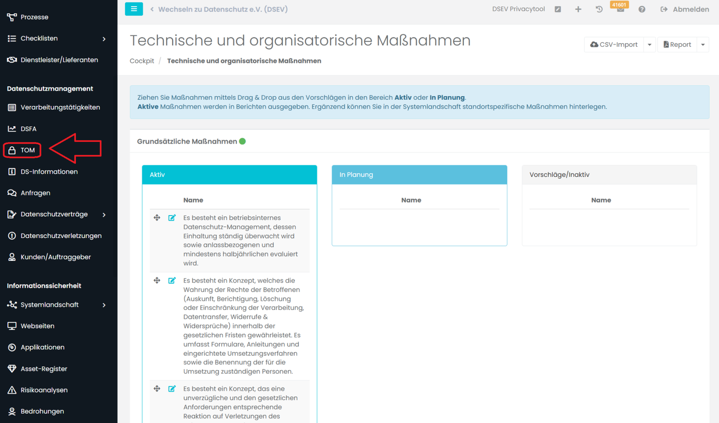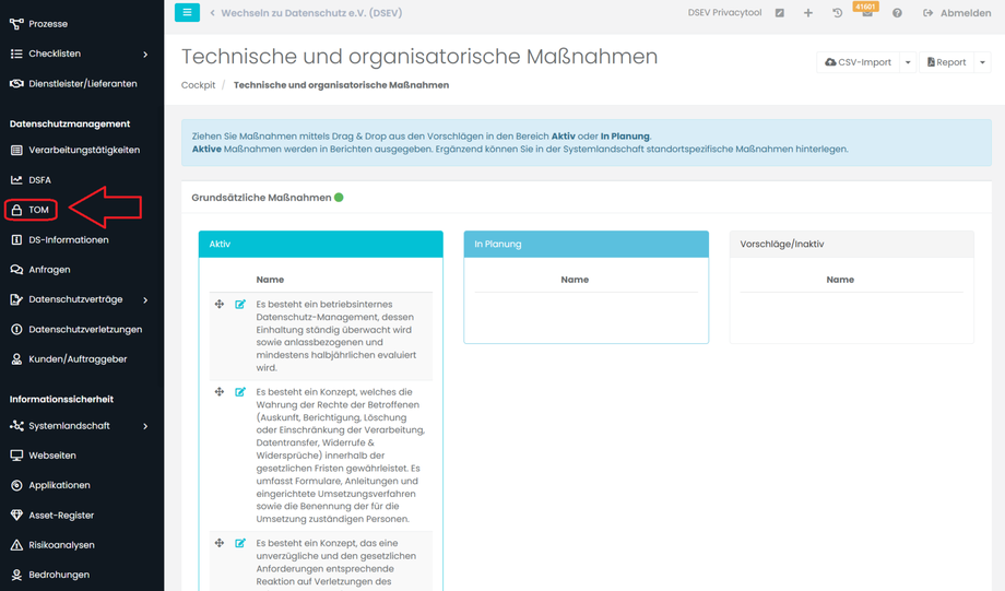 In diesem Abschnitt unter TOM können Sie technische und organisatorische Maßnahmen ganz einfach per „Drag and Drop“ anlegen (aktiv oder in Planung).