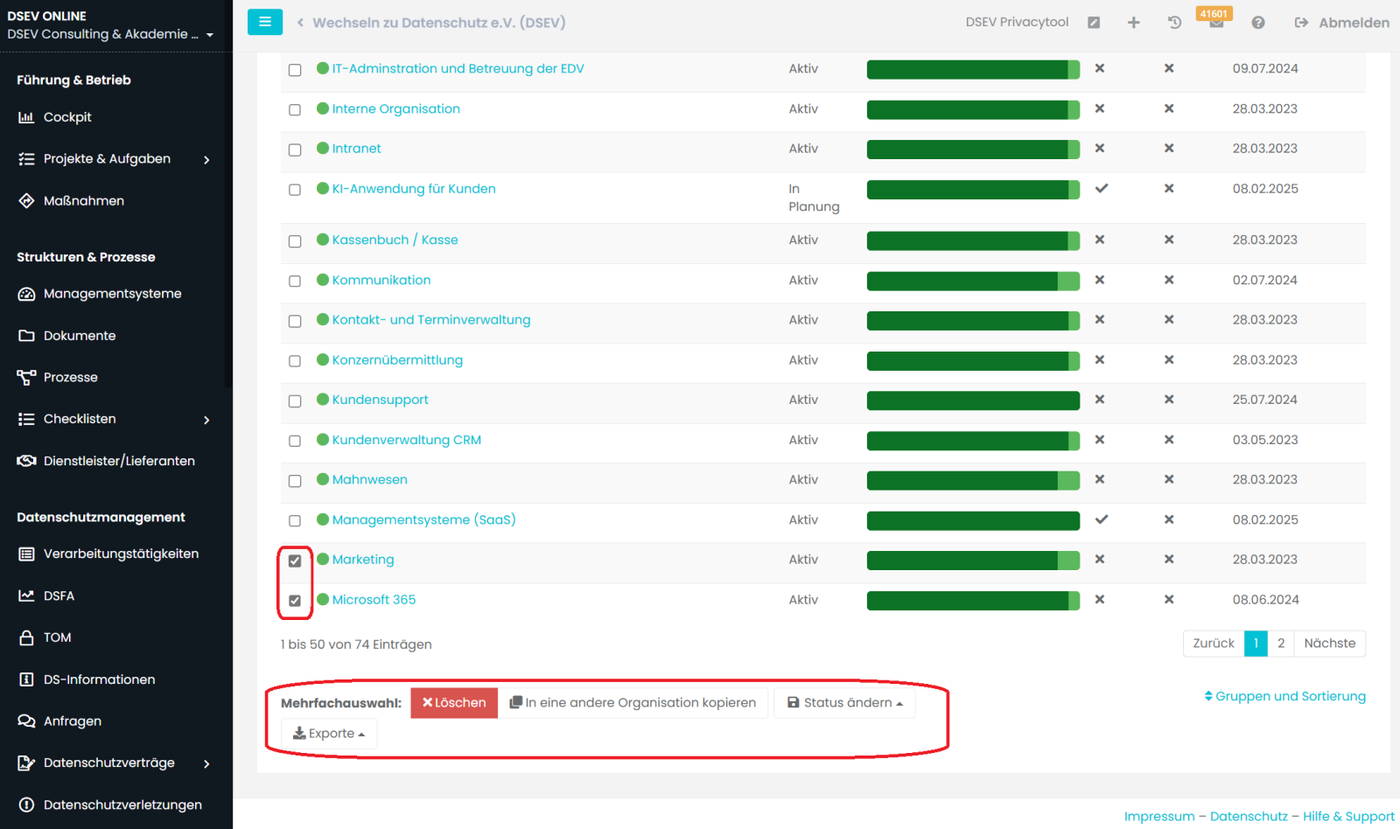 Es besteht eine Importmöglichkeit von vorhandenen Verarbeitungstätigkeiten als Excel-Datei (CSV). Der Excel- Export kann ausgeführt werden, wenn eine oder mehrere Verarbeitungstätigkeiten mit der Checkbox (vor dem Namen) ausgewählt werden. Dann besteht auch die Möglichkeit, die ausgewählten Tätigkeiten zu Löschen oder in eine andere Organisation zu kopieren oder den Status zu ändern (Aktiv, Inaktiv, in Planung).