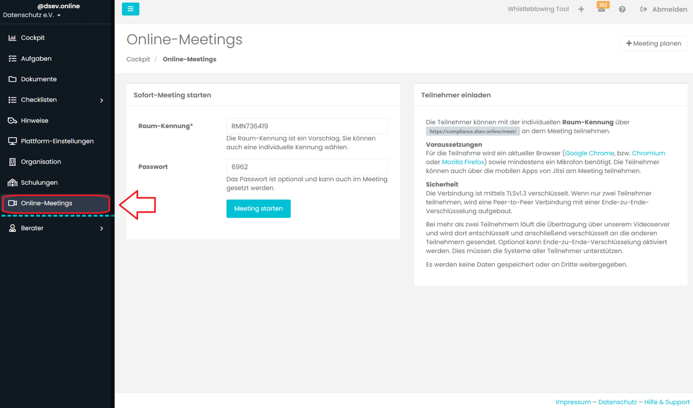 Die Teilnehmer können mit der individuellen Raum-Kennung über https://compliance.dsev.online/meet/ an dem Meeting teilnehmen.