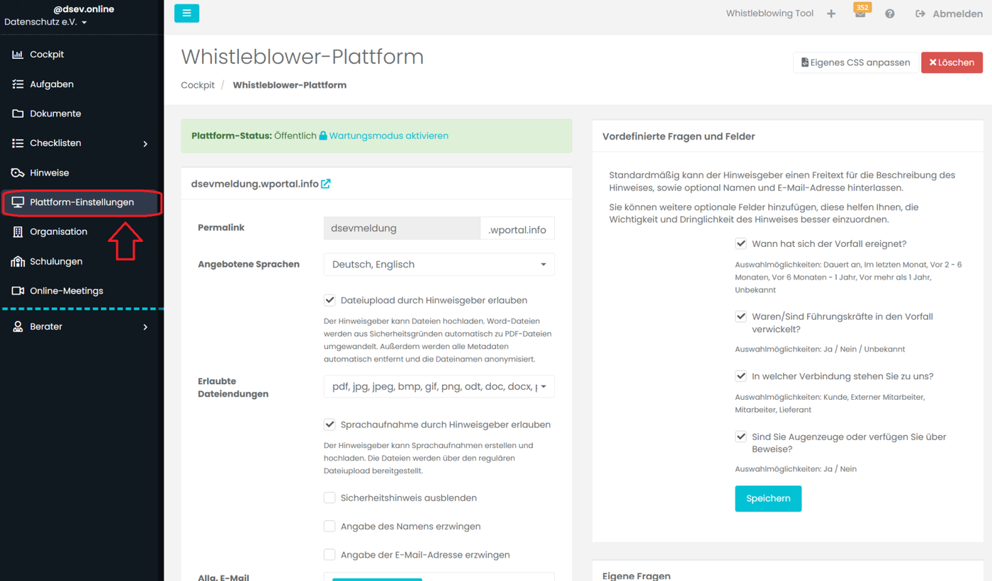 - Die URL, welche Hinweisgeber aufrufen, um zum Portal zu gelangen.