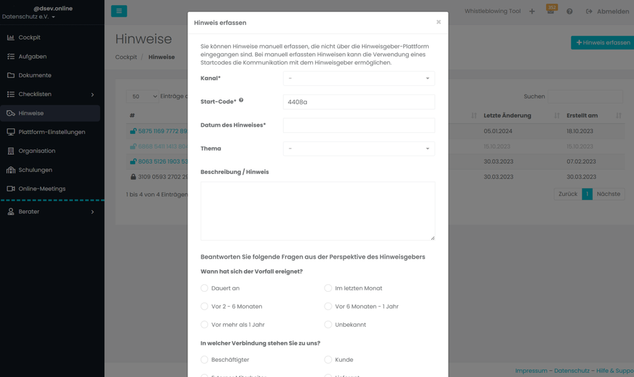 Auch Hinweise, die nicht über das Portal eingereicht werden können und sollen im Portal angelegt werden. Auch hier sind Fristen zu beachten und Dokumentationen zu erstellen.
