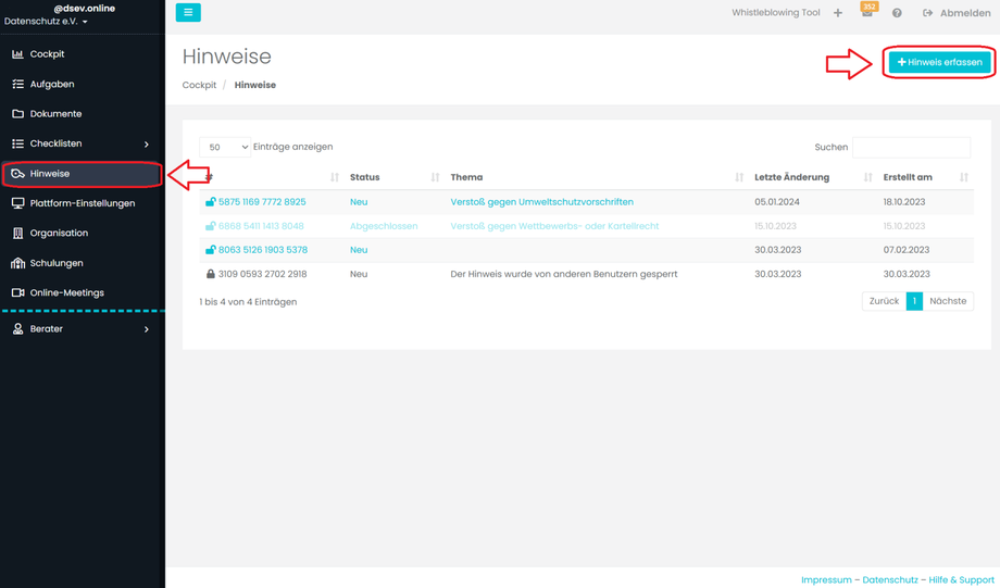 - Unter Hinweise werden alle eingegangenen Hinweise aufgelistet. Sie sehen auf einen Blick den aktuellen Status der Bearbeitung, das Thema und die Anmerkungen.